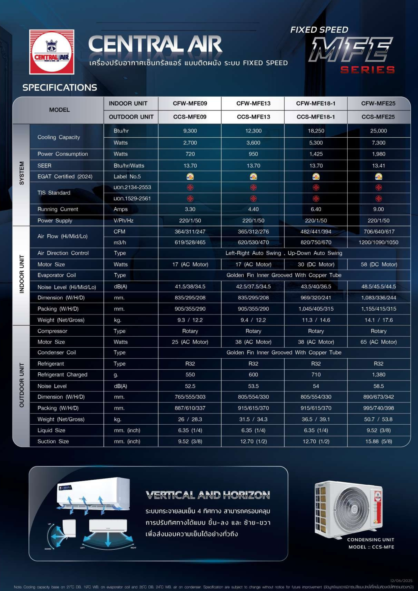 CFW-MFE09 : 9,300 BTU CFW-MFE13 : 12,300 BTU CFW-MFE18 : 18,250 BTU CFW-MFE25 : 25,000 BTU